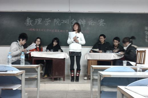 本次辩论赛共有两组参赛。正方选手为李宏波、康艳丽、杨烁、徐常。反方选手为张博蓉,豆欢娣、周俊杰,周鹏。比赛以有理有据,以理服人为原则,唇枪舌战之后,最终以反方稍占优势胜。正方选手杨烁获得最佳辩手。
