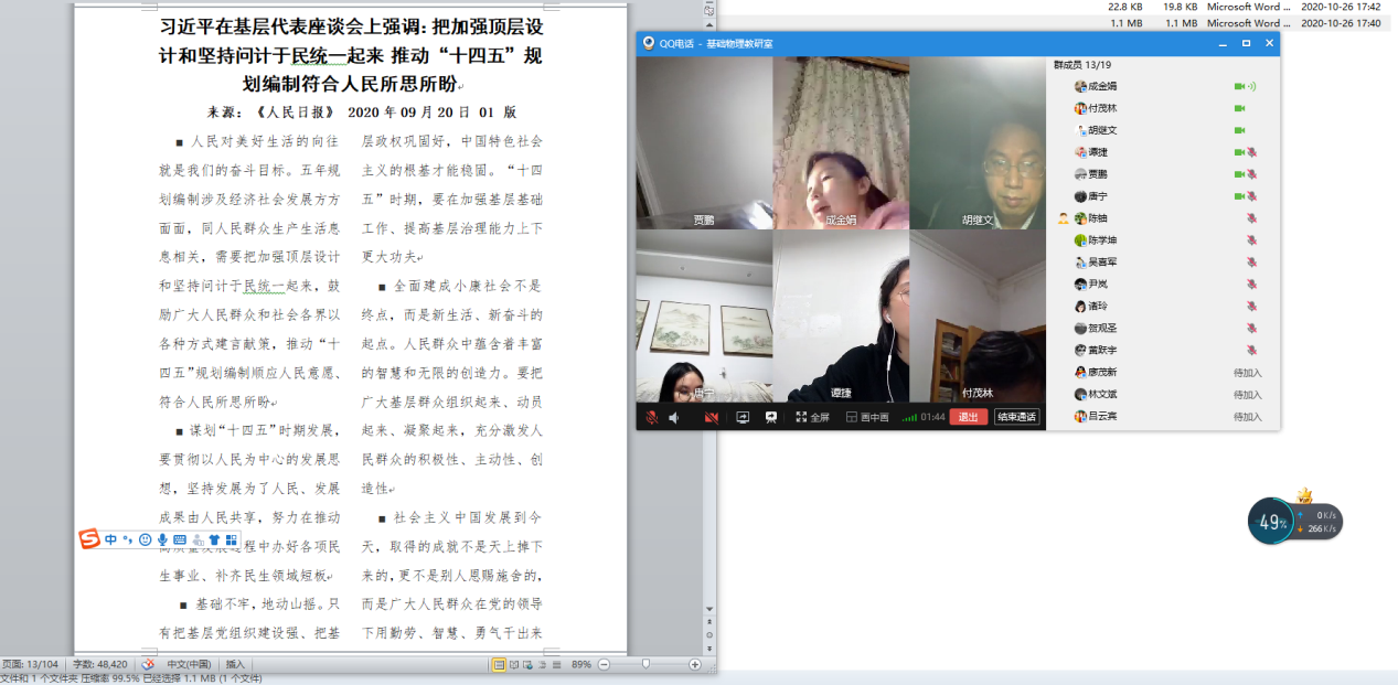 教研室老师通过QQ视频会议,由支部书记主持,通过在QQ群发送的教职工理论学习资料,并由陈铀领读了《习近平在湖南考察时强调:在推动高质量发展上闯出新路子 谱写新时代中国特色社会主义湖南新篇章》的文章,由成金娟领读了文章《习近平在基层代表座谈会上强调:把加强顶层设计和坚持问计于民统一起来 推动“十四五”规划编制符合人民所思所盼》。